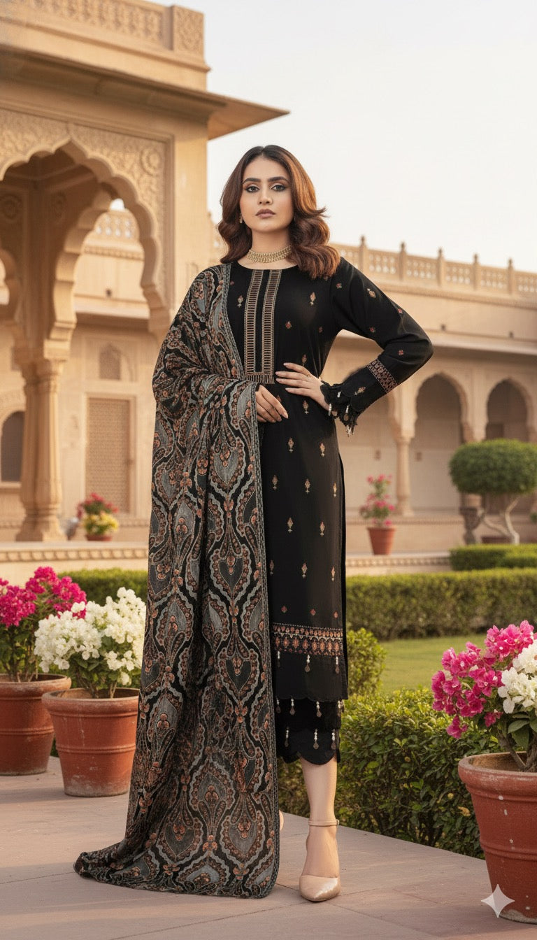bareeze Hot selling article NF 501 Premium Quality Danak 3PC - Luxury Embridered Shirt with Dyed Trouser with Lazurer cut applic shawl