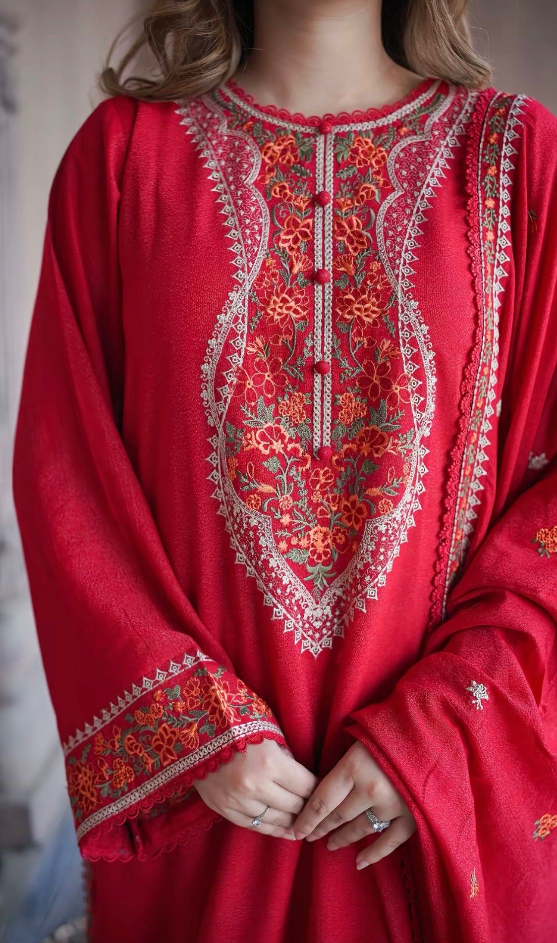 Aneelas Hot selling article NF 756 Premium Quality Danak 3PC - Luxury Embroidered Shirt with Dyed Trouser with Luxury Embroidered Shawl